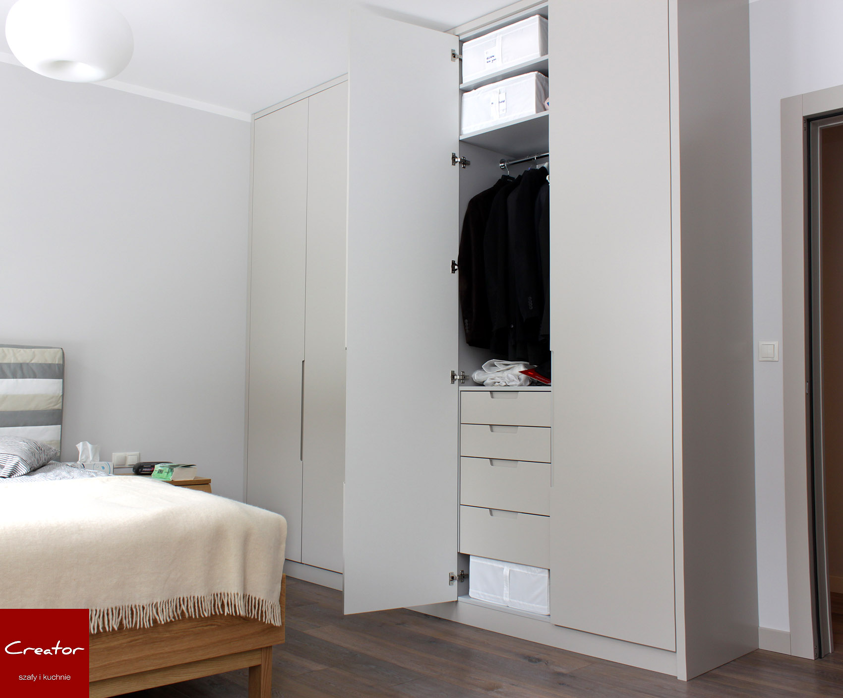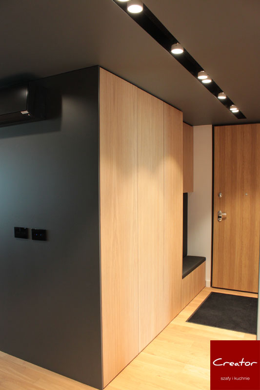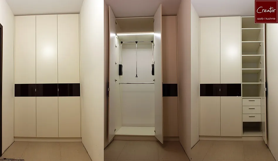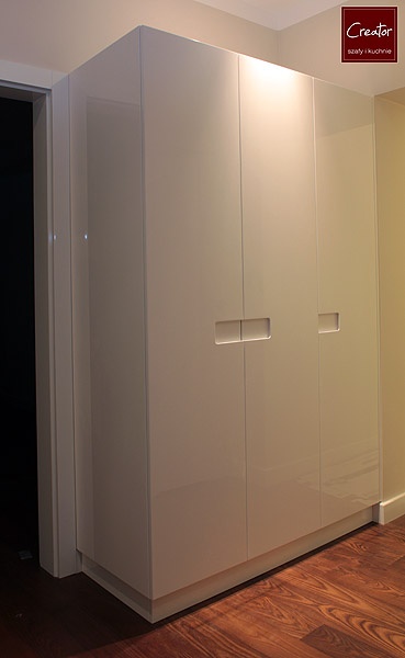 Nowoczesny design szaf to przede wszystkim ogromne gładkie powierzchnie frontów w wykończeniu matowym lub z połyskiem. Nowoczesne szafy wnękowe projektowane są często tak, aby nie było ich praktycznie widać. Wtapiają się w kolorystykę ścian, stanowiąc doskonałą bazę dla pozostałych elementów wyposażenia mieszkania. Jest to trend naszym zadaniem odpowiedzialny, który umożliwia w przyszłości zmianę dekoracji i nadanie wnętrzu nowego charakteru. Należy pamiętać, że szafy nowoczesne to jednocześnie współczesne rozwiązania techniczne. Do aranżacji wnętrza szafy firma Creator wykorzystuje między innymi szuflady z cichym dociągiem, drążki opuszczane (pantografy), wysuwane półki na buty, wieszaki na spodnie, wewnętrzne i zewnętrzne oświetlenie LED i szereg innych akcesoriów.